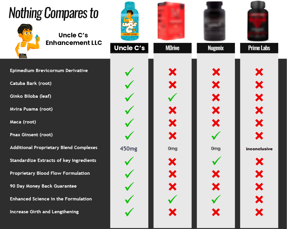 Uncle C’s CANNOT be matched by any other male enhancement supplement. Amid the highly potent standardize Epimedium Brevicornum Derivative, which is the base of our formulation, Uncle C’s is guaranteed to give you the results you desire every time. What's more, Uncle C’s may contribute to a longer sexual session, thus allowing you greater pleasure and greater enjoyment. Uncle C’s is the #1 Male Enhancement Supplement in the World.